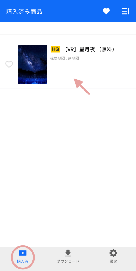 DMM VR動画プレイヤーアプリを開くと「購入済み商品」の部分に購入したVR作品が表示されます。
